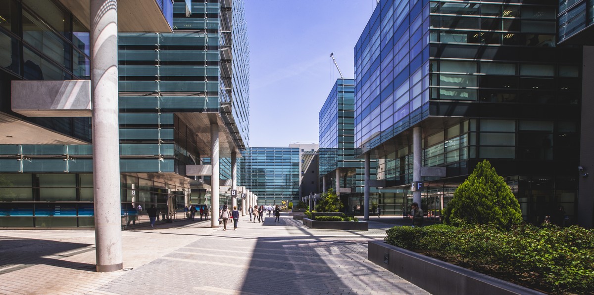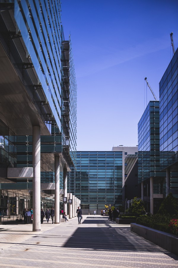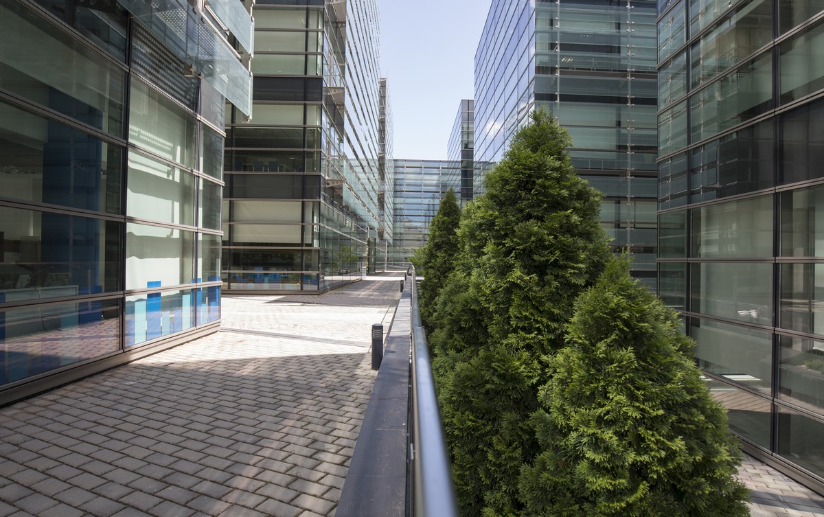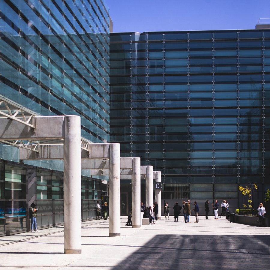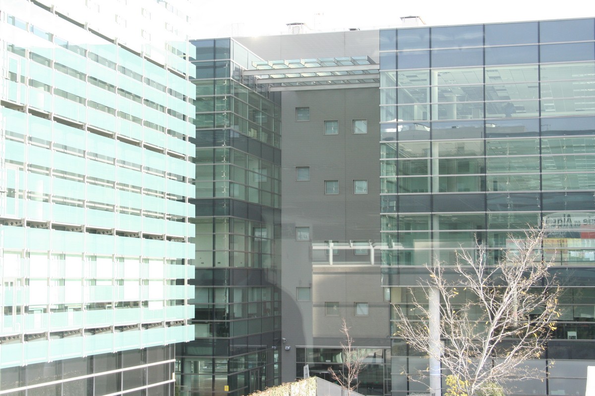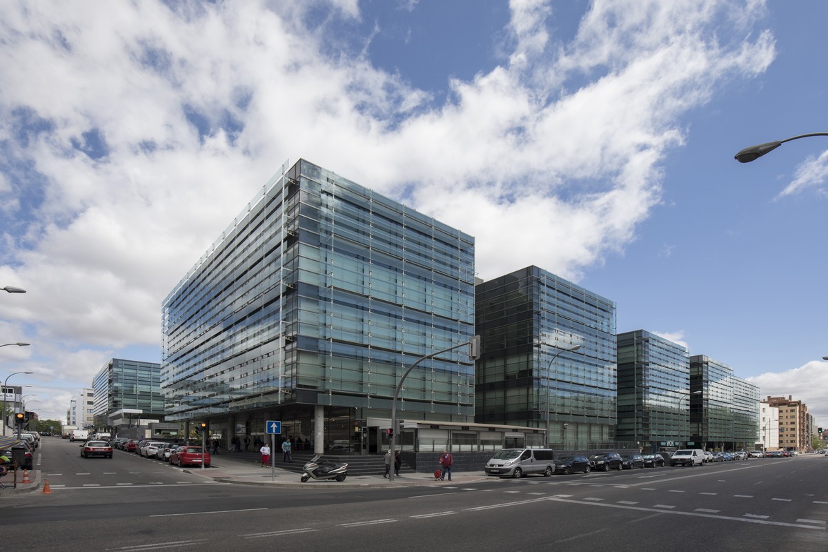 El complejo se compone de nueve edificios con una impactante estética de fachada muro cortina, obra del prestigioso estudio Federico Echeverría.